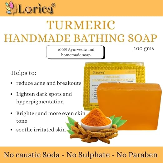 Lorica Turmeric Bathing Soap – Unlock the Power of Nature’s Golden Healer Indulge in the ancient wisdom of Ayurveda with Lorica’s Turmeric Bathing Soap, carefully crafted to nourish and rejuvenate your skin. Enriched with the potent benefits of Turmeric, this glycerine-based soap gently cleanses and purifies the skin, leaving you feeling refreshed and revitalized. The Magic of Turmeric that helps: – Natural Anti-Inflammatory: Turmeric’s active compound, has potent anti-inflammatory properties that help soothe and calm irritated skin. – Antibacterial and Antifungal: Turmeric’s antimicrobial properties help protect the skin from infections and promote a healthy skin microbiome. – Antioxidant-Rich: Turmeric’s antioxidants help neutralize free radicals, reducing oxidative stress and promoting radiant, youthful-looking skin. Benefits of Lorica Turmeric Bathing Soap: – Soothes and Calms: Reduces redness and irritation, perfect for sensitive skin. – Purifies and Cleanses: Gently removes dirt and impurities, leaving skin feeling clean and refreshed. – Brightens and Evens: Helps reduce the appearance of dark spots and hyperpigmentation, promoting a brighter, more even-toned complexion. – Hydrates and Nourishes: Glycerine-based formula moisturizes and nourishes the skin, leaving it feeling soft and supple. – Natural Glow: Turmeric’s antioxidant properties help promote a natural, radiant glow.